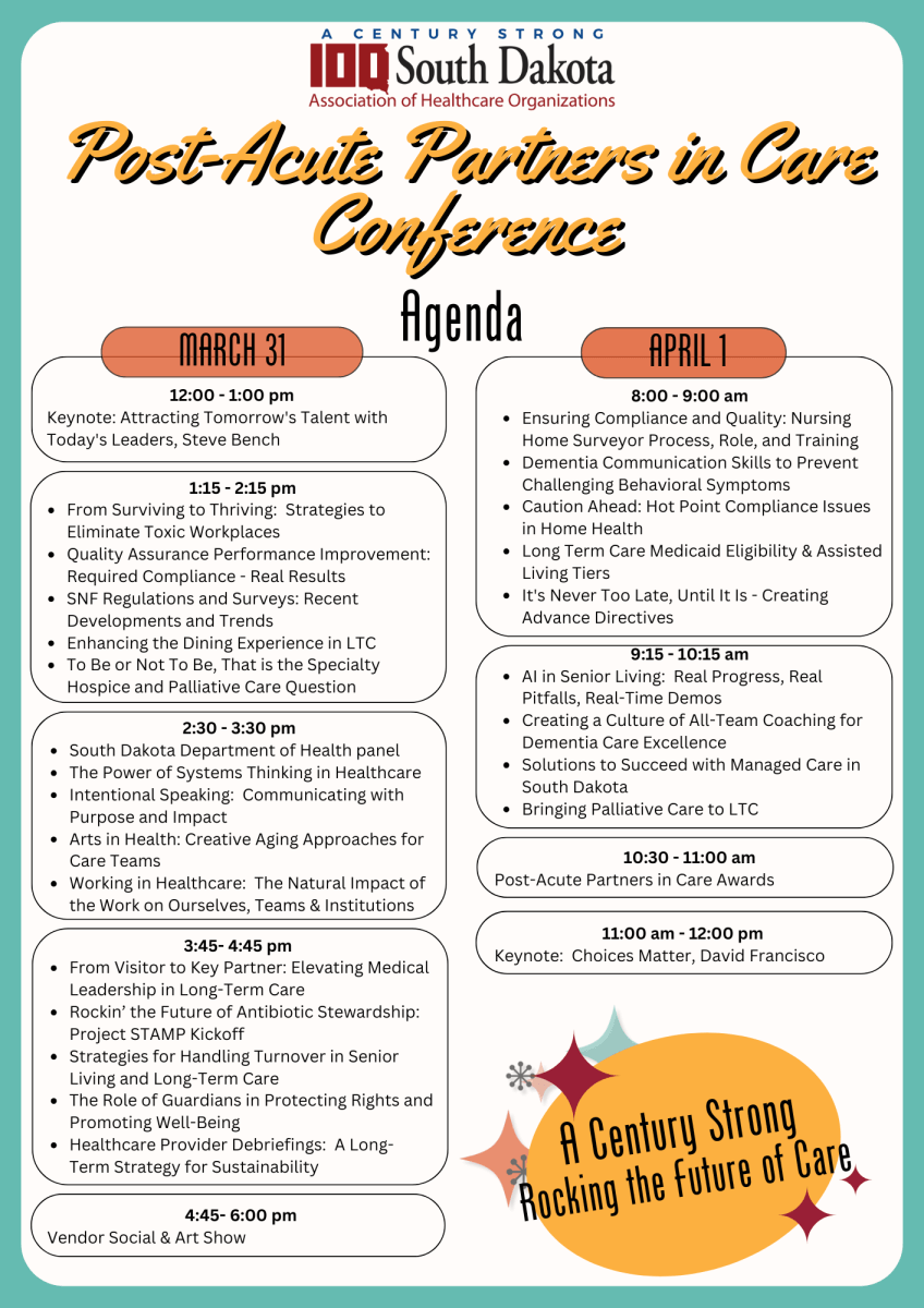 The landscape of post-acute care is evolving faster than ever. To keep pace, you cannot afford to stand still. Your greatest asset isn’t just your facility or your equipment; it is you. Register for the 2026 Post-Acute Partners in Care Conference: A Century Strong: Rocking the Future of Care, Tues. March 31 – Wed. April 1, 2026, at the Sioux Falls Convention Center.